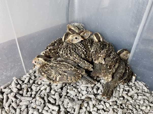 Ciao a tutti! Oggi le mie 7 quagliette compiono 3 settimane! E in effetti ormai non possono più essere definite “baby quaglie”. Ormai sono adolescenti. E come tutti gli adolescenti…SONO SCATENATE!!! Ormai sono perfettamente in grado di volare, anche se non hanno ancora preso bene dimestichezza con tutti i trucchi del volo. Per questo ci vorranno mesi. Adesso hanno già una bella codina di 4 centimetri e il petto è già ricoperto dal piumaggio mimetico. Manca ancora il piumaggio della schiena mentre quello della testa è l’ultima cosa che crescerà, e verso le 5–6 settimane i maschi inizieranno a far crescere delle piume nere sotto gli occhi. E’ proprio questo il primo segno che mi permetterà di distinguere i sessi. In seguito inizieranno a fare la muta delle piume del petto: le femmine sostituiranno il piumaggio mimetico attuale con delle piume marrone-verdine, i maschi con piume grigio-blu.