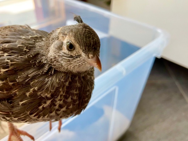 Ciao a tutti! Oggi le mie 7 giovani quagliette californiane compiono 6 settimane! Qualche giorno fa vi ho raccontato di come ora riesco a distinguere i sessi, e che sono 2 maschi e 5 femmine, e sono veramente contento di come stanno crescendo e di come si stanno abituando alle persone, alla casa e alla routine giornaliera. Ecco uno dei “ragazzi” che mi guarda mentre gli scatto una foto, come per dire: “Che cavolo vuole questo paparazzo da me??”: