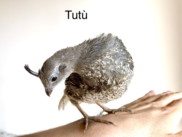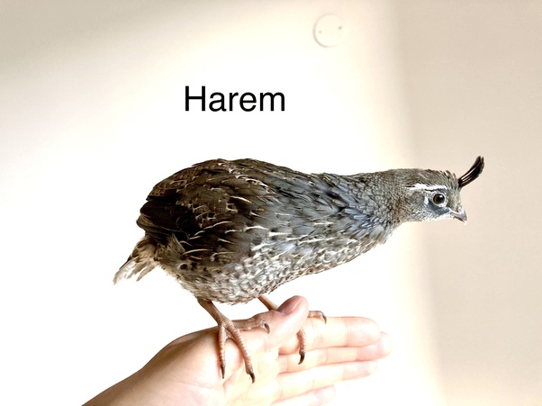 Lui è l’unico maschietto rimasto, e il significato del nome mi pare abbastanza ovvio, 1 maschio che convive con 4 femmine!🤣 Ma tranquilli, Harem sceglierà solo una femmina a stagione, e le altre probabilmente le picchierà. Infatti le quaglie californiane sono annualmente monogame, nel senso che cambiano femmina ogni anno ma per quell’anno sono estremamente fedeli al partner scelto, e tendono a scacciare le altre quaglie. Io e Gianluca abbiamo calcolato che c’è una probabilità del 47% che per una qualsiasi coppia maschio-femmina, i due non siano fratelli. Infatti sono sicuro che 2 delle 7 uova dell’incubazione non erano state deposte della medesima femmina. Ma veniamo ad Harem. Dei due maschi (l’altro è Dorito, che ho affidato a Federica), Harem è sicuramente il più scatenato, ma anche quello che sta più volentieri sulla mano. Spesso corre a destra e a sinistra come un forsennato, così dal nulla, e ovviamente fa scatenare anche le femmine. Quando mi avvicino a lui con la mano, lui si appiattisce a terra in segno di sottomissione, facendo un pigolio caratteristico. In questa posa posso afferrarlo a due mani e anche se non gradisce molto all’inizio, poi si tranquillizza e sta lì con le zampe a penzoloni. Quando sale in mano è molto tranquillo, e spesso si siede e resta lì rilassato, magari guardando fuori dalla finestra (come faceva il mio Alvin!!!😭).