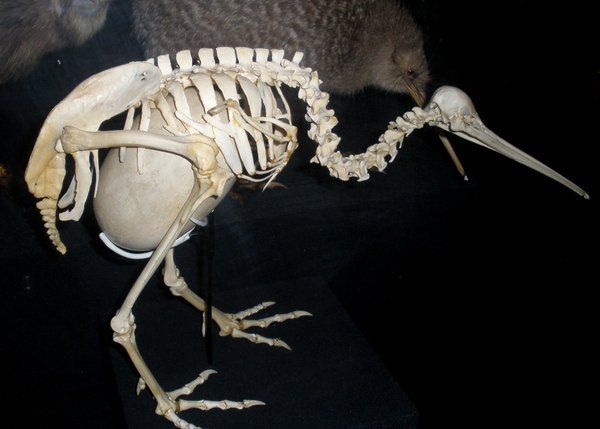 I kiwi hanno uova sproporzionatamente grandi, fino al 20% del peso corporeo della femmina. La femmina fa un’enorme fatica sia a portare l’uovo dentro di se che a deporlo. Qui sotto, uno scheletro di kiwi femmina con il suo uovo, per darvi l’idea delle proporzioni:
