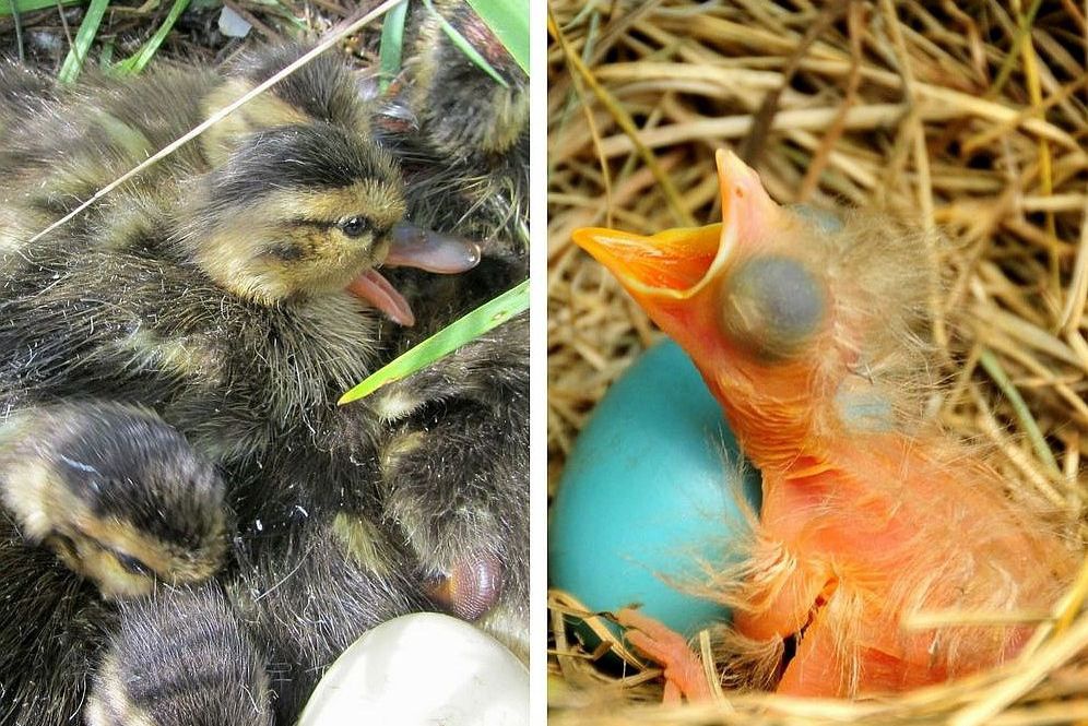 Qui sotto a sinistra, pulcini precoci, a destra pulcini inetti e totalmente dipendenti dai genitori: