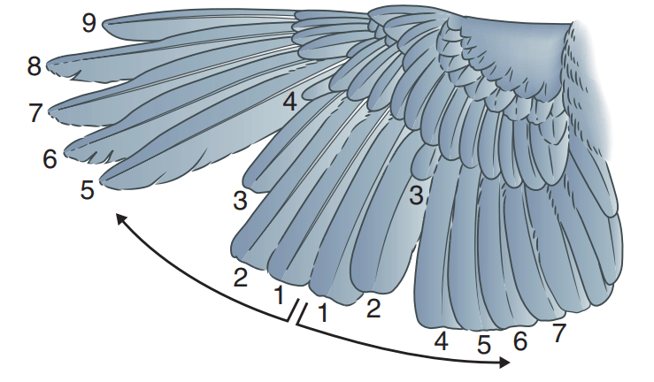Ma la parte più critica di questa muta è ovviamente il volo. Infatti, un uccello non può permettersi di rendere il volo molto più impegnativo perdendo le remiganti a casaccio. La natura ha pensato anche a questo! Per far si che la stabilità del volo non venga compromessa (con conseguenze spiacevoli), gli uccelli perdono le remiganti in modo simmetrico: quando una remigante di un’ala cade, cade anche la stessa remigante sull’altra ala. E lo stesso vale per le timoniere della coda. E persino la sequenza di muta delle penne non è casuale. Solitamente infatti la muta parte dal centro dell’ala muovendosi verso l’esterno per le remiganti primarie e verso l’interno per le remiganti secondarie: