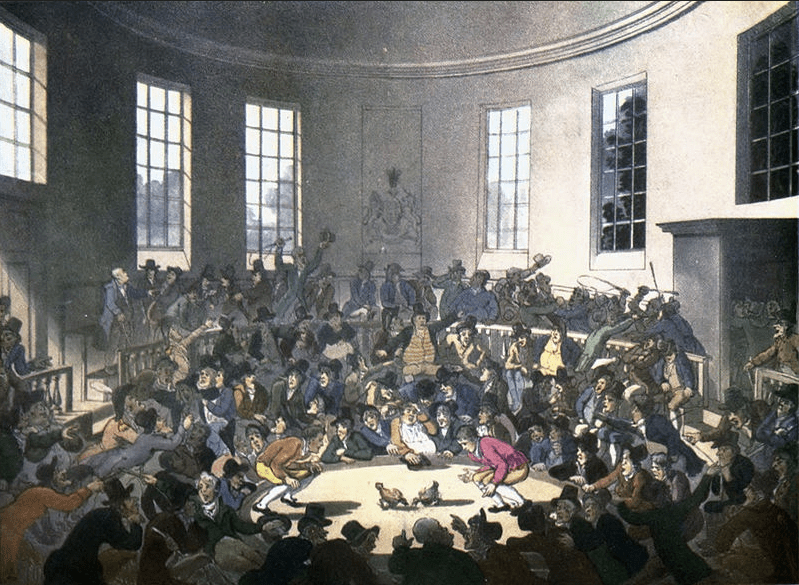 Innumerevoli le testimonianze storiche, come questo dipinto risalente al 1808 che mostra un combattimento tra galli a Londra, circa 27 anni prima che venisse dichiarato illegale: