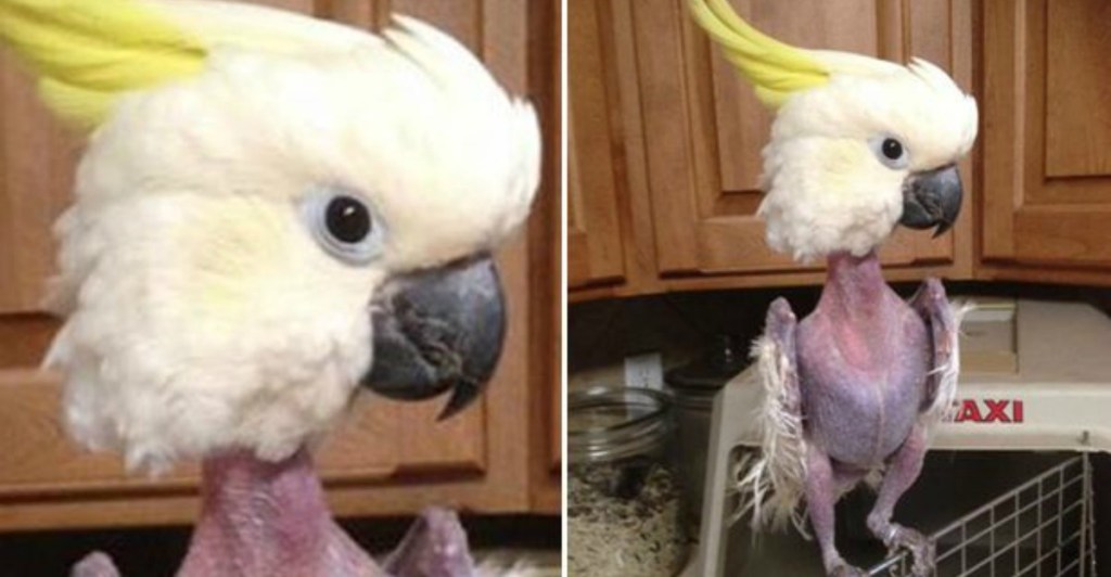 Qui sotto, un cacatua che a causa dello stress da incuria si è strappato quasi tutte le piume del corpo: