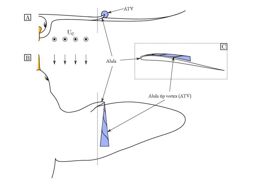 Nella maggior parte delle situazioni, l’alula è tenuta schiacciata contro l’ala, e viene sollevata e spostata in base alle necessità. Quando l’uccello vola a bassa velocità o atterra, l’alula viene spostata leggermente verso l’alto e in avanti, creando una piccola fessura sul bordo d’attacco dell’ala. Funziona allo stesso modo delle lamelle verticali sull’estremità delle ali di un aereo, e consente all’ala di raggiungere un angolo di attacco superiore al normale senza provocare uno stallo. La punta dell’alula forma un minuscolo vortice che forza il flusso d’aria sopra l’ala per aderire meglio ad essa. Ecco l’aspetto del vortice (in blu):