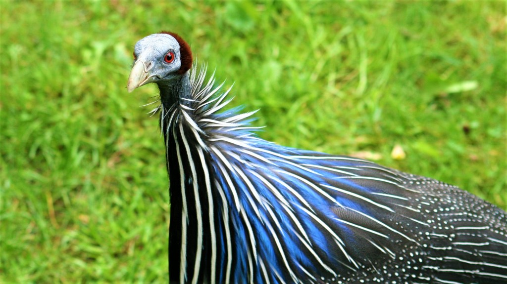 Questo uccello molto particolare è originario del continente africano, ed è un cugino della gallina faraona d’allevamento. E’ chiamata “vulturina” per via della sua testa senza piume, ma ovviamente non è imparentata con gli avvoltoi, essendo un galliforme. Il suo piumaggio è davvero incredibile, con striature bianche, nere e blu su collo e petto, mentre il resto del corpo è nero a pois bianchi. Poi il petto è di un azzurro intenso ipnotico, e io le ho anche viste dal vivo.
