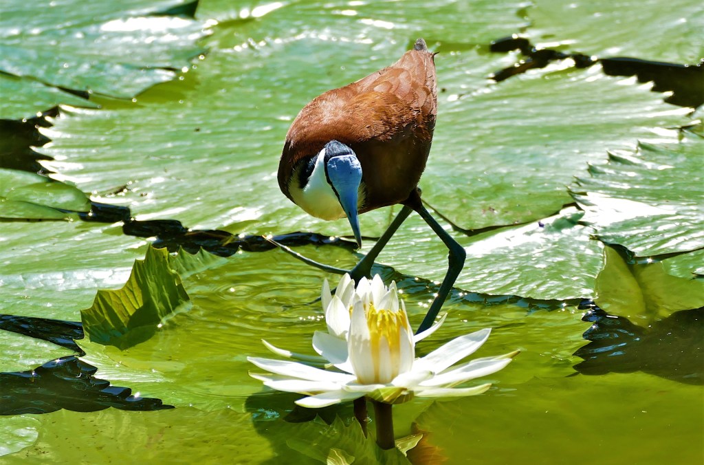 Questi uccelli dalle zampe enormi sono anch’essi originari dell’Africa. Sono uccelli acquatici, e le loro zampe enormi gli permettono di camminare sulle foglie di ninfea senza sprofondare, perché il loro peso è meglio distribuito. Come per tutti i jacana, anche in questa specie è il maschio ad occuparsi al 100% della cova e dell’allevamento della prole. I piccoli lasciano il nido quasi subito e seguono il padre, che per difenderli dai pericoli li raccoglie letteralmente tenendoli con le sue ali e portandoli in salvo.
