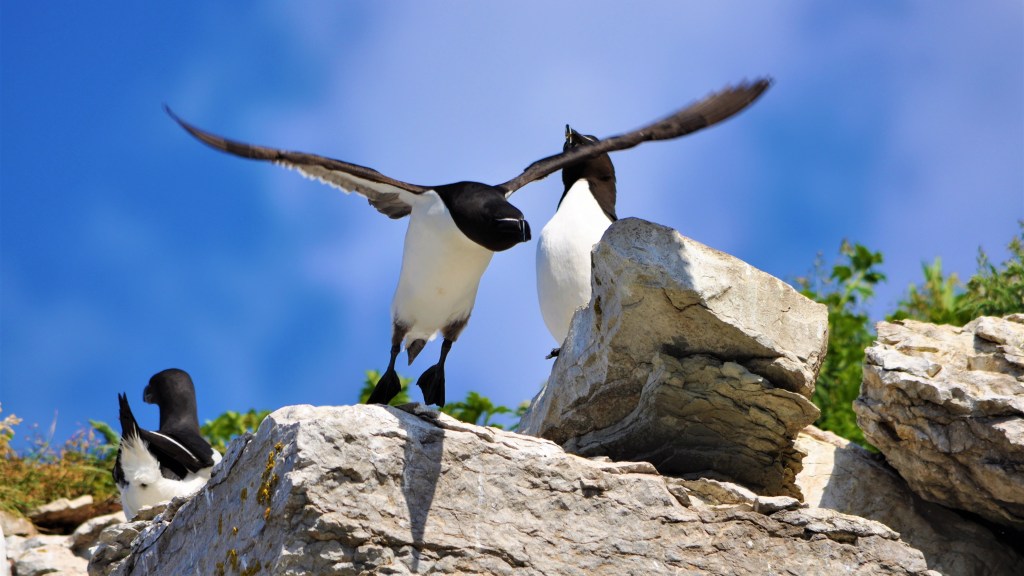 Questo uccello marino bianco e nero, superficialmente simile a un pinguino, è in realtà in grado di volare. Nidifica sulle scogliere del nord Europa e nord America in enormi colonie miste. E’ un eccellente nuotatore, ed è in grado di volare sott’acqua fino ad una profondità di 120m. Ho specificato “volare” perché è proprio quello che fa! Infatti nuota sbattendo le sue ali corte e robuste, più adatte a nuotare che a volare. Per cercare cibo può spingersi fino a 100km dalla costa. I suo richiami sono dei grugniti molto poco aggraziati.
