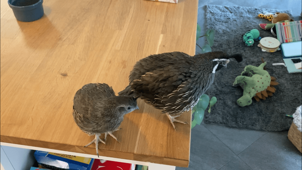 Sto già iniziando a pregustarmi il giorno in cui, quando andrà a scuola e si parlerà di animali, lui racconterà agli amici e alle maestre dei suoi pennuti domestici, animali che non avranno mai visto né sentito in vita loro. Ma mio figlio sì! Non i soliti e inflazionatissimi cani e gatti, ma uno stormo di bellissime, simpaticissime e inusualissime quaglie californiane.