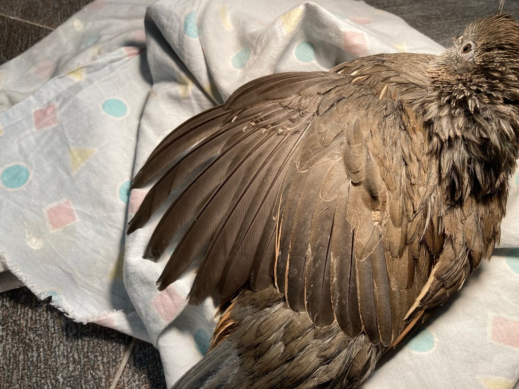 Con molta fatica sono riuscito ad ispezionargli le ali, e appunto ho constatato che le penne stanno crescendo bene. Tuttavia delle penne così lunghe impiegano circa 1 mese a riscescere completamente, quindi questa situazione precaria durerà un bel po’, e io dovrò stare SUPER attento a cosa gli salta per la testa. Nella seguente foto si vedono bene le 4 remiganti secondarie in crescita ad ala chiusa (cerchiate di rosso), mentre le remiganti primarie le ha perse di recente e non si vedono ancora quelle nuove: