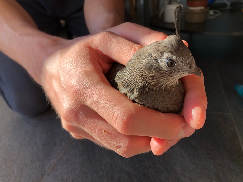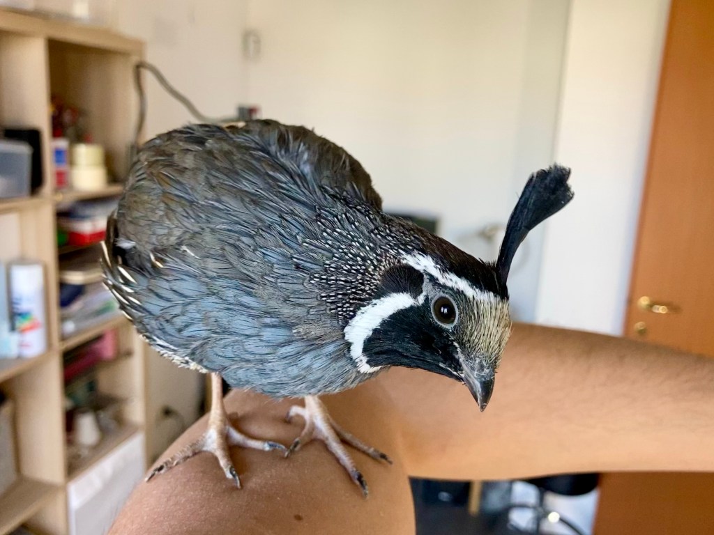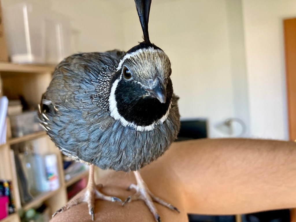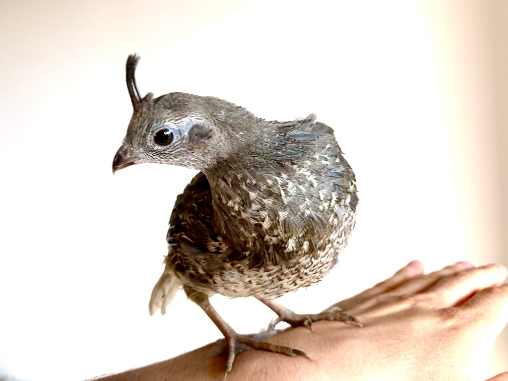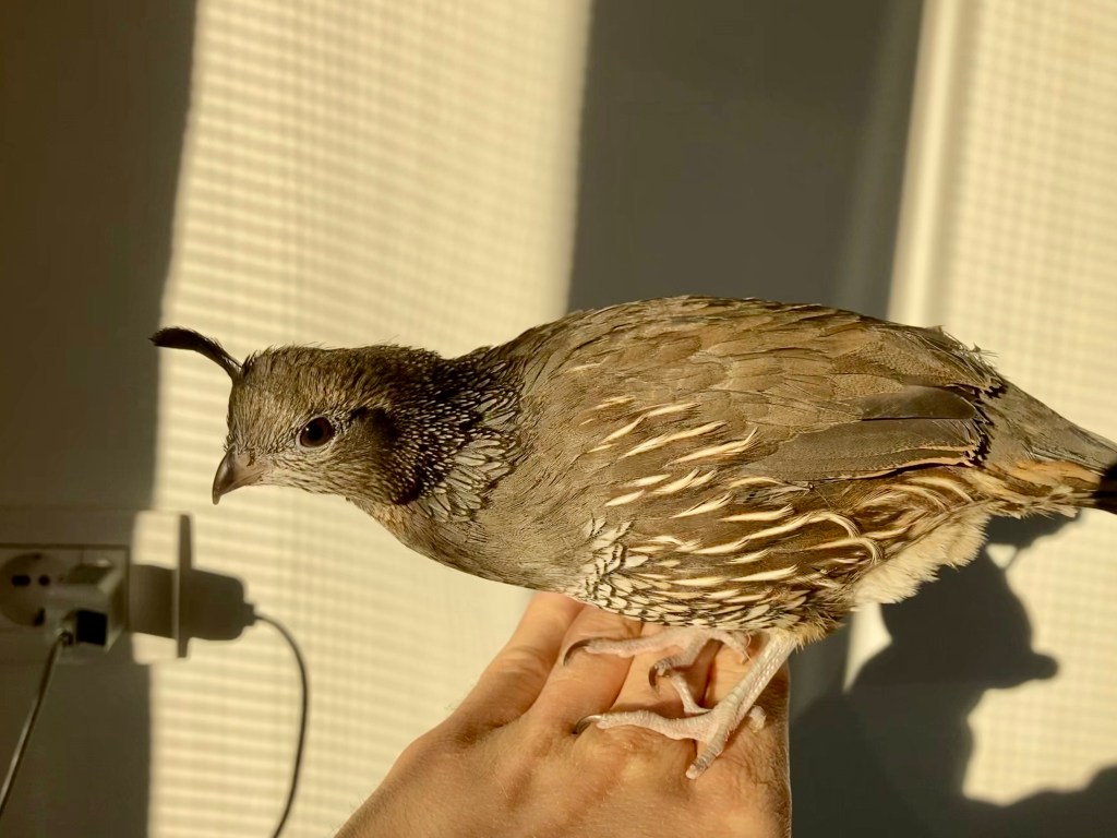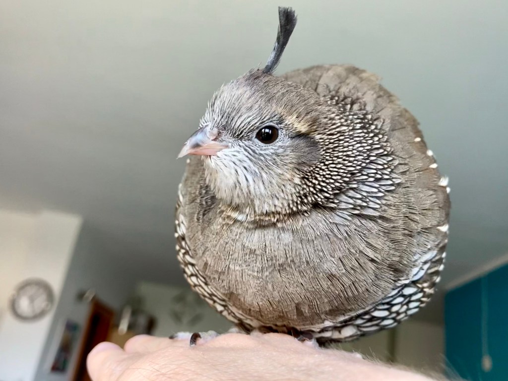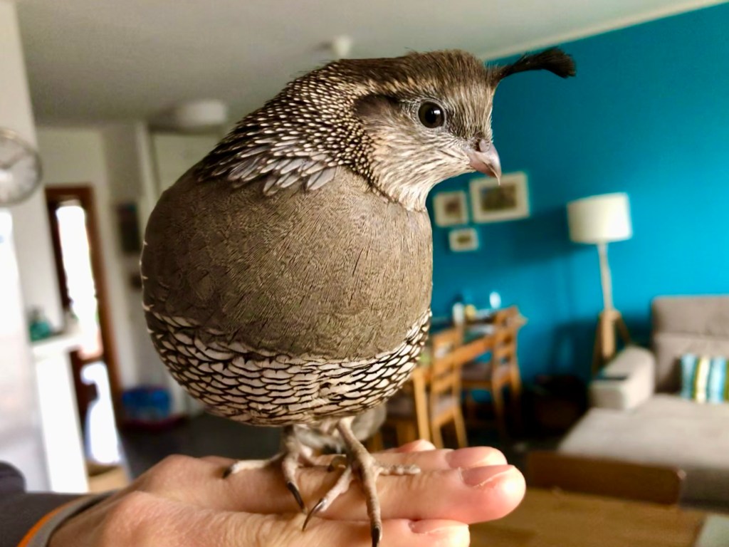 Tra tutte le femmine, Zen è sicuramente la più sveglia, intraprendente e curiosa, ed è la mia preferita. Lei è sempre la più impaziente di uscire dalla scatola per poter esplorare la casa e sgranchirsi le ali con i suoi voli pazzeschi. Tra tutte le femmine, Zen è quella con la postura più standard per una femmina di quaglia californiana: rotonda quanto basta e mai troppo parallela al suolo. A differenza delle sue sorelle, Zen non sopporta di essere agguantata a due mani, ed è incredibile con quanto anticipo riesce a capire che sta per succedere, dandosela a gambe. Ma la sua non è paura nei miei confronti, perché salta sulla mia mano senza problemi e si fa trasportare in giro in tutta tranquillità, quanto piuttosto una specie volontà di mantenere la sua indipendenza, una specie di forma primitiva di orgoglio aviano. Quando era piccola c’è stato un periodo in cui i fratelli la bullizzavano, e lei non vedeva l’ora che la portassi via da loro. Addirittura, quando la bullizzavano fuori dalla loro casa Zen correva da me per cercare protezione!