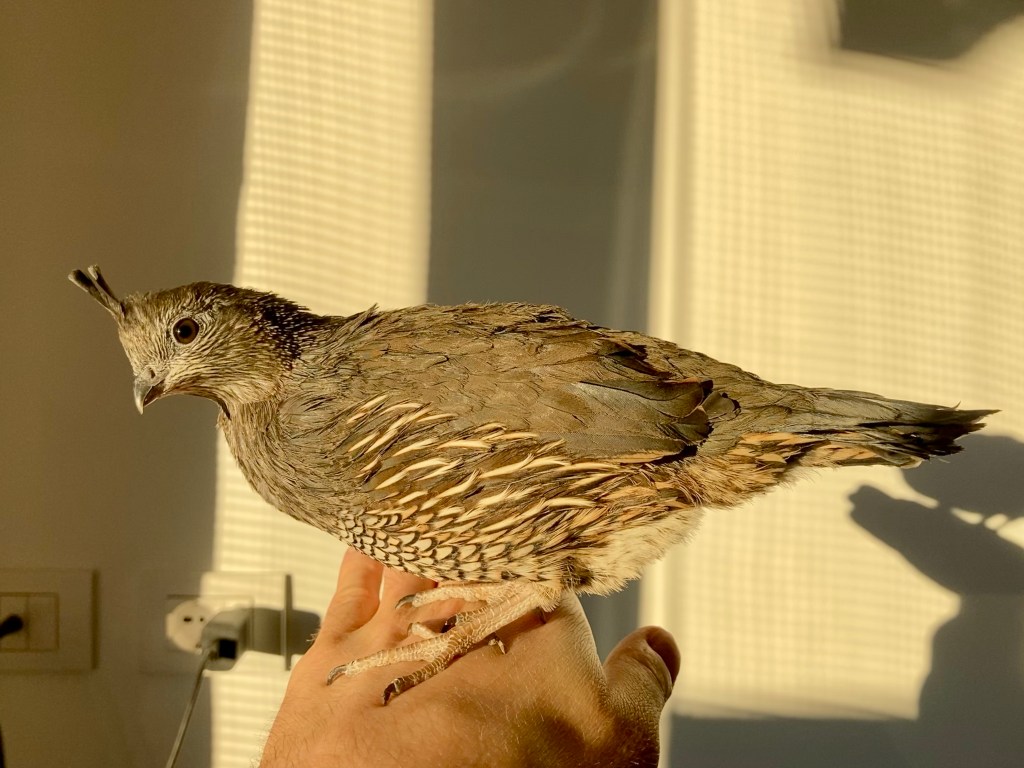 Per quanto riguarda le femmine, vorrei spendere due parole anche sulla povera Tutù, morta improvvisamente il 21 ottobre scorso. Tutù era senza dubbio la meno domestica di tutte le quaglie che ho avuto in casa mia, nonostante fosse nata e cresciuta nello stesso identico ambiente di tutte le altre. Questo suo aspetto non fa altro che rafforzare il tema di questo post, ovvero che ogni quaglia ha la sua personalità unica e le sue inclinazioni. Purtroppo con Tutù ho interagito molto poco, nonostante salisse anche lei sulla mano facilmente, perché non ha mai apprezzato il contatto e la vicinanza con gli esseri umani. Era molto schiva come la sua migliore amica Windows, ed era sempre la quaglia più distante da me in ogni momento. Se cercavo di prenderla a due mani, aveva delle reazioni quasi da quaglia selvatica, e rischiava di farsi male (soprattutto se era nella scatola). A causa di ciò, ho sempre cercato di rispettare la sua natura schiva e paurosa, e non ho mai cercato di forzare l’interazione con lei, perché è una cosa che non ho mai voluto. Per me, o la naturale interazione viene da sè e senza traumi nè forzature, oppure non se ne fa nulla, perché far soffrire un animale per mio tornaconto personale non mi darebbe alcuna soddisfazione (e lo stesso vale per gli esseri umani che frequento). Una cosa molto curiosa, che sembrerebbe indice di selvaticità delle quaglie californiane femmine, è la forma della testa. Infatti Windows e Tutù, le più selvatiche, hanno un’espressione diversa dalle altre femmine nate il 5 maggio 2021 (Zen, Belle e Fedora). Sembra quasi che hanno occhi leggermente più grandi e zigomi meno sporgenti, tratti che gli conferiscono un’espressione più selvatica. Non ho idea se ci sia qualche correlazione genetica tra selvaticità e forma della testa oppure no. Detto ciò, mi spiace comunque un sacco che sia morta così senza alcuna possibilità d’intervento, anche se era la quaglia meno interattiva. Inoltre era la fidanzata di Harem, e lui ci è rimasto molto male, tant’è che subito dopo ha perso quasi tutte le remiganti forse per una specie trauma psicologico.