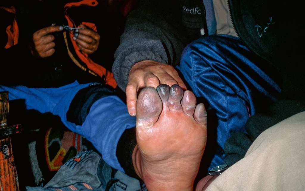 Provate voi a stare a 11.000 metri senza tuta e senza bombole, e vediamo quanto sopravvivereste! Forse qualche decina di minuti? A quella quota ci sono circa 56 gradi sotto zero e solo il 23% della pressione atmosferica al livello del mare. Per non parlare poi dei fortissimi raggi UV solari che vi fanno arrosto. In queste condizioni estreme sopraggiungono dopo poco tempo edema polmonare e cerebrale, e i sintomi comprendono confusione mentale, psicosi, allucinazioni, tosse, e infine raptus, coma e morte. Per questo motivo, prima di tentare una scalata ad alte quote, gli alpinisti si recano là settimane prima per abituare il corpo alla quota, alzando il campo base di massimo 300 metri al giorno. Fonte Ma comunque credo siano dei pazzi suicidi! Gli esseri umani sono ben noti per cercare costantemente di trovare e infrangere i limiti del corpo umano, a volte con gravi e irreversibili conseguenze…