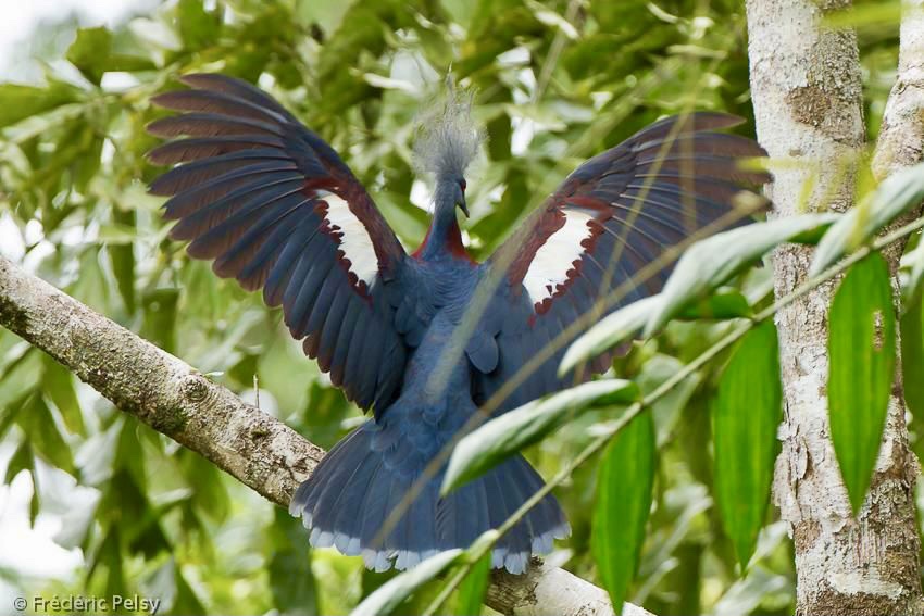 Ecco un maschio di gura di Vittoria in un parco zoologico che emette il suo bassissimo richiamo “tubante” di fronte alla videocamera. Notate poi la forma della cresta:
