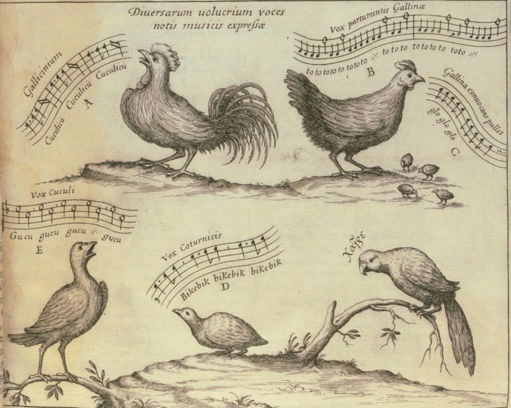 La Sonata Representiva di Heinrich Biber, del 1669, è suddivisa in sezioni etichettate con nomi di uccelli e altri animali. Biber usa lo sfregamento delle corde e gli unisoni stonati per imitare l’usignolo, il cuculo, il gallo e la gallina. Diversi compositori hanno scritto opere che rappresentano molti uccelli diversi, come il Bird Fancyer’s Delight di John Walsh, del 1715, che è una raccolta di brevi pezzi musicali etichettati con nomi di uccelli, che aveva lo scopo di insegnare agli uccelli da gabbia a cantare (video qui sotto).