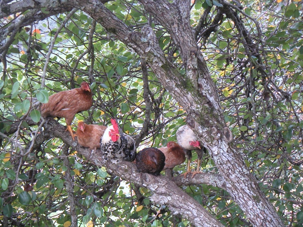 Le galline, a differenza delle quaglie euroasiatiche, sono uccelli in grado di percare, su posatoi ovviamente proporzionati alle loro dimensioni. Infatti, se tenute libere, le galline vanno sugli alberi a dormire o a riposare. Proprio come in questa foto: