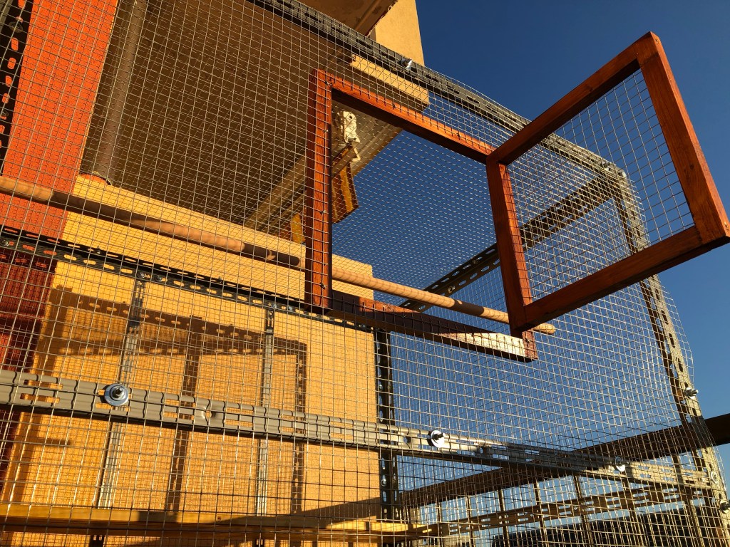 Tornando alle mie californiane, questi sono uccelli enormemente diversi dalle Coturnix, nonostante vengano chiamate comunemente “quaglie” della California. Sono infatti uccelli che volano più spesso e che hanno un volo molto più agile. Inoltre, contrariamente alle Coturnix, le Callipepla sono uccelli che percano regolarmente (“to perch”, in inglese), ad esempio andando sugli alberi a dormire tutte le notti (ma non solo). Ma sono comunque uccelli molto terricoli che hanno bisogno di “rotolarsi” a terra, una delle loro attività preferite. Quindi hanno bisogno di una casa idealmente cubica, con molti posatoi e con una base molto ampia. E indovinate? Una gabbia così, che non sia troppo grande, NON ESISTE! O te la costruisci da solo o “ti attacchi”. E io, che sono costantemente affetto dalla “sindrome di Geppetto”, ovviamente non mi sono fatto scoraggiare. Dopo un progetto mentale durato un mese, ho comprato i materiali e in 4 giorni ho costruito una voliera su misura sia per il mio balcone, sia per le quaglie californiane. E questo è il risultato (ma ve ne avevo già parlato in passato):