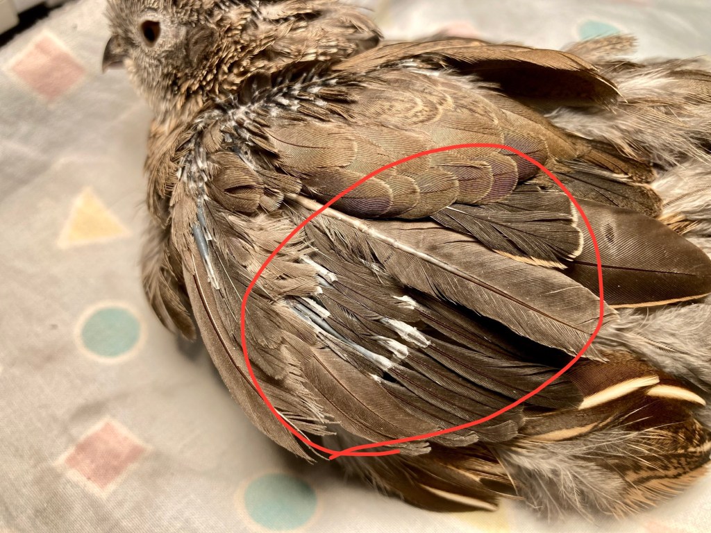 Ciao a tutti! Eccoci con un nuovo post di aggiornamento sulle mie quagliette, a quasi 5 settimane dall’incidente, quando Belle e Zen si erano distrutte le ali a seguito di un attacco di panico causato da un temporale notturno. Inoltre, Harem aveva perso mezza coda e, in seguito all’accaduto, Belle aveva anche iniziato una muta molto violenta. Morale? Belle e Zen non hanno potuto volare per almeno 3 settimane abbondanti. Le penne e le piume di Belle e Harem hanno iniziato a ricrescere subito e bene, mentre le remiganti di Zen hanno avuto una crescita “ritardata” facendomi preoccupare che le si fossero danneggiati i follicoli delle penne, e che quindi non avrebbe mai più volato. Per fortuna però le penne sono ricresciute anche a lei! Ecco lo stato della ricrescita di Zen dopo 3 settimane dall’incidente: