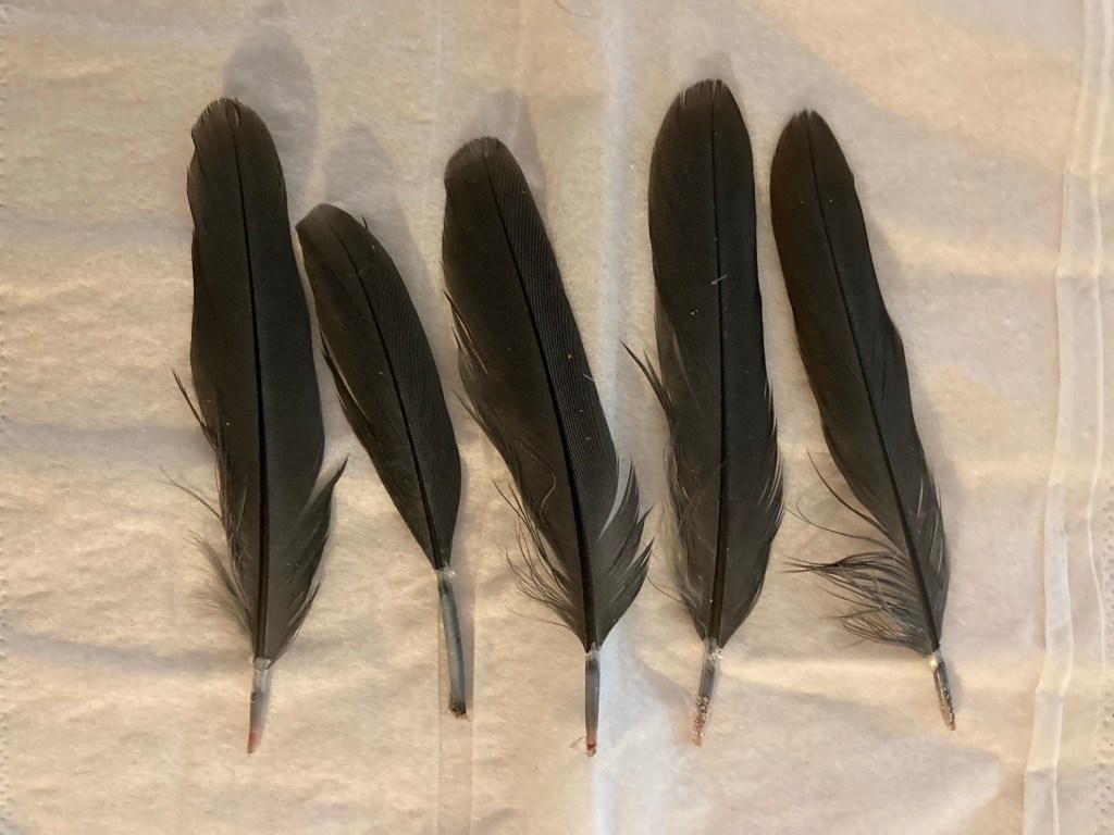 La sua coda era ricresciuta quasi del tutto e sto cretino ha pensato bene di distruggersela di nuovo!!! L’altra sera era in corso il loro tramonto domotizzato e Harem è letteralmente impazzito!!! Ero già a letto e sono andato di là a controllare: la scatola di Harem era disseminata di penne della sua coda, lui era terrorizzato, e le femmine pure, ma per fortuna loro non si sono fatte nulla. Ecco le remiganti perse, che stavano ancora crescendo (mancavano tipo 5 millimetri!):